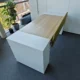 Juodai pilkas recepcijos stalas. Puse stalo dengia juodas anstatas kurio aukštis nuo stalo 40 cm, gylis 20 cm. Stalviršyje yra elektronikos laidų išvedimo anga.